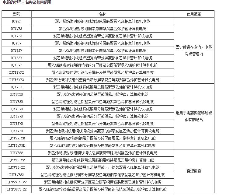 屏蔽材料有圓銅線(xiàn)、銅帶、鋁箔/塑料復(fù)合帶三種。屏蔽對(duì)與屏蔽對(duì)具有較好的絕緣性能,電纜在使用中若屏蔽對(duì)與屏蔽對(duì)之間出現(xiàn)電位差時(shí),不會(huì)影響信號(hào)的傳輸質(zhì)量。 計(jì)算機(jī)電纜的型號(hào)、名稱(chēng)及使用范圍見(jiàn)表。